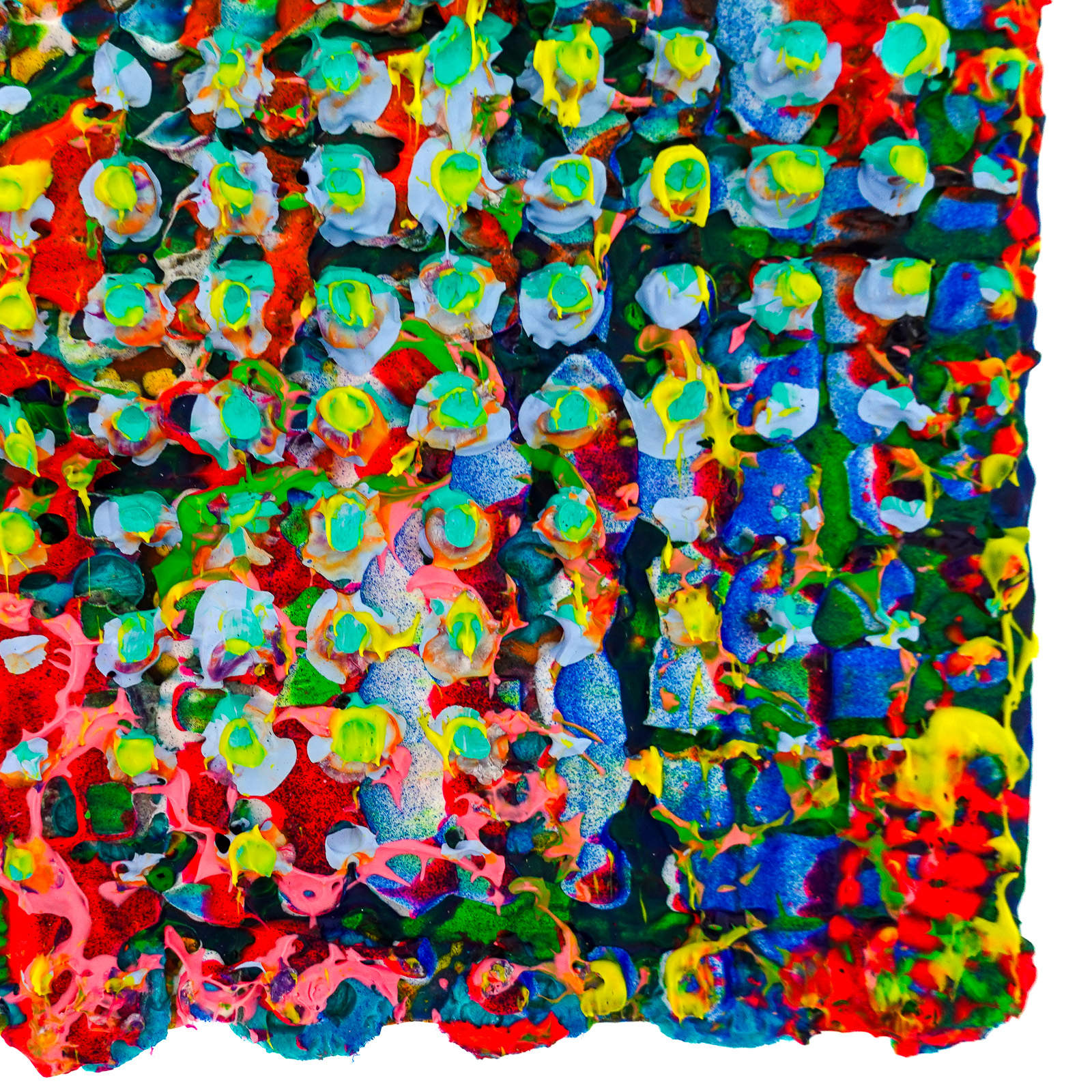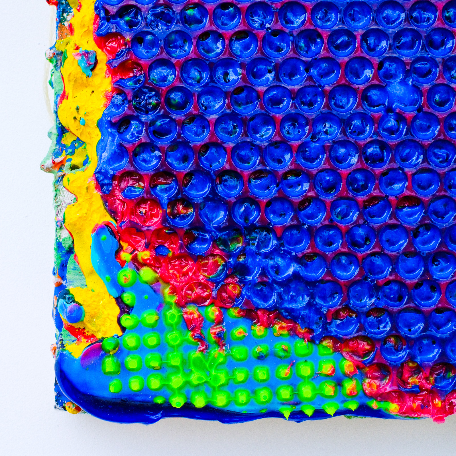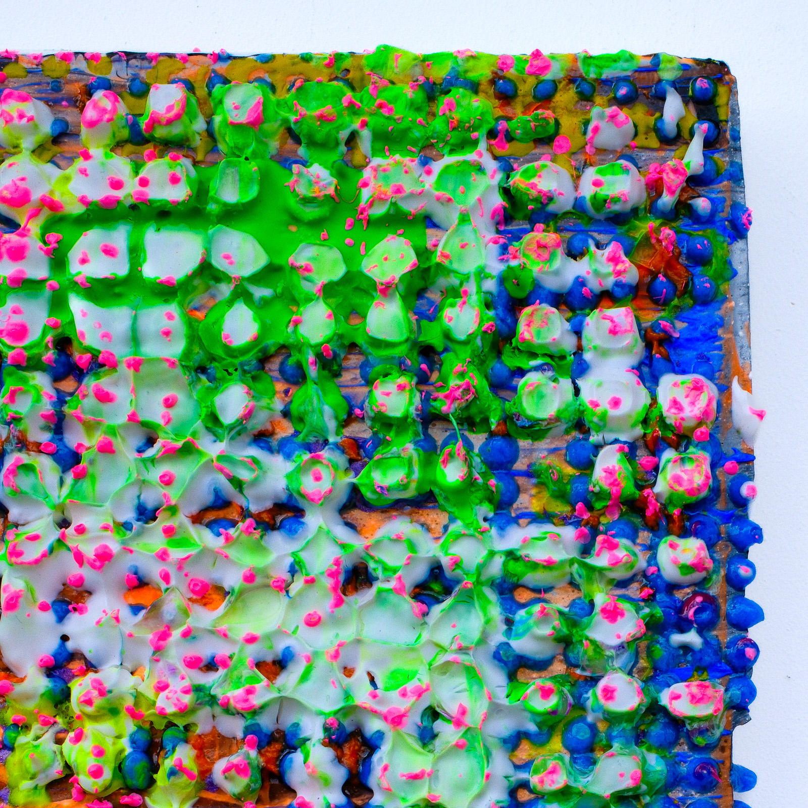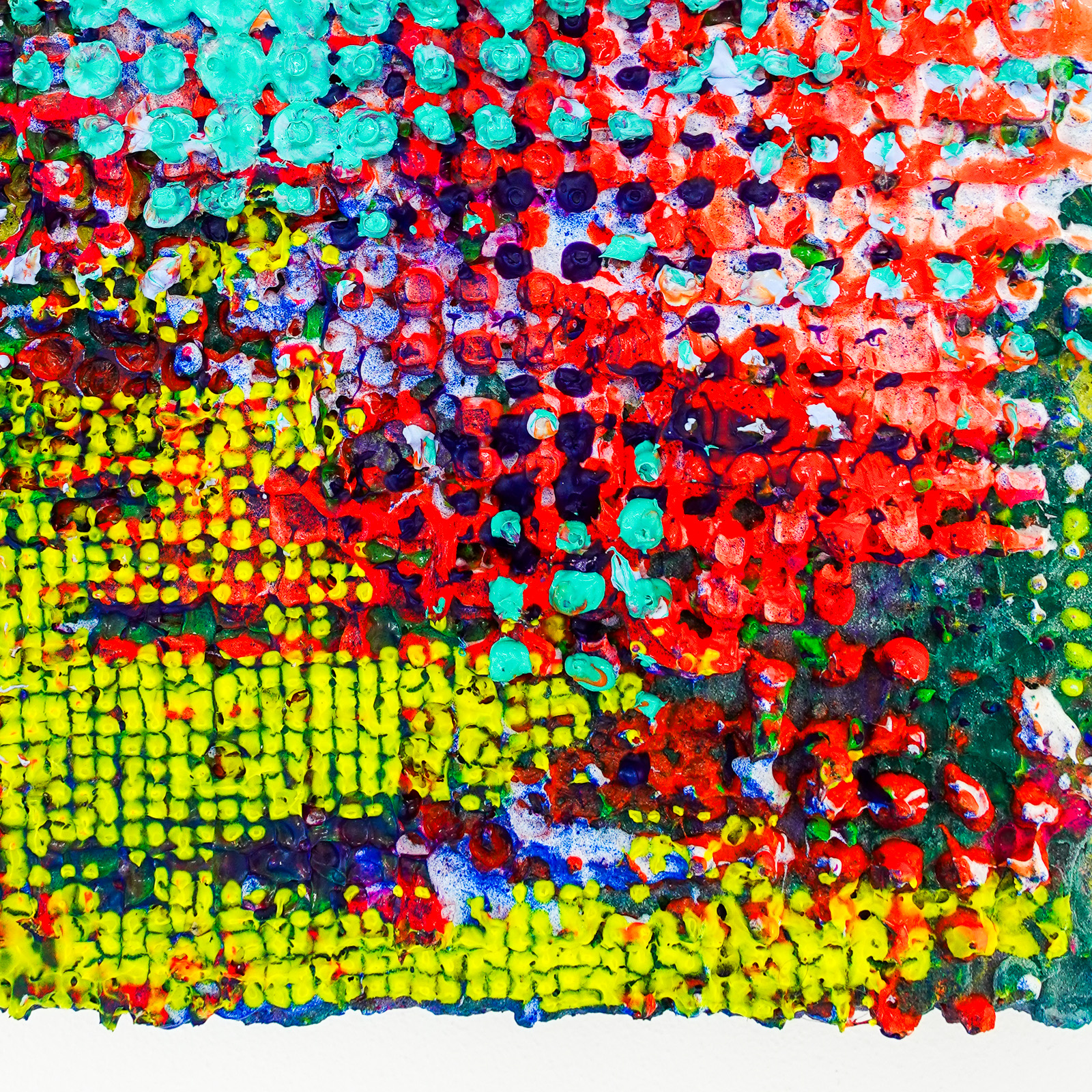 Het resultaat is kleurrijk en tactiel werk waarin structuren elkaar afwisselen en kleuren resoneren. In ieder stukje valt iets nieuws te ontdekken.