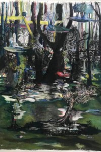 De natuur is voor Bergsma rijk en vol beloften. De onder- en bovengrondse natuur is voor haar moeiteloos met elkaar verbonden. Door haar gemengde achtergrond (Nederlandse vader en Indische moeder) is ze zich altijd bewust van het mystieke. In haar tekeningen vertaalt ze dat vaak naar de uiterst zwarte delen, daar waar het onbekende huist. Maar als je goed kijkt, is het zwart niet zozeer duister, het is vooral rijk en vol beloften. Haar tekeningen zijn fragmenten van werelden, die zich pas in volle omvang aan je onthullen als je er zelf instapt.Haar tekeningen en assemblages hebben een link naar de wereld zoals we die kennen, maar er is ook altijd een ondertoon van een ongrijpbaarder werkelijkheid. Haar fascinatie voor de botanische natuur werd gevoed door de plek waar ze opgroeide: aan de rand van de stad en dicht bij de weilanden, sloten en bosjes.